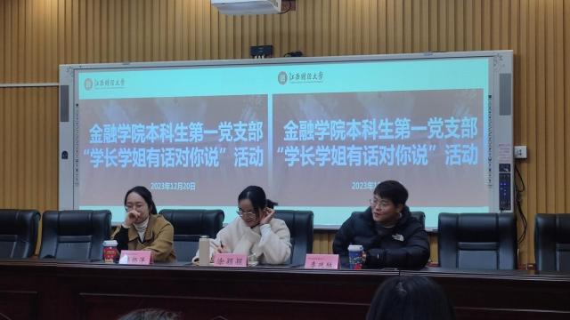 2023年12月20日下午,国产自拍 本科生第一党支部在翼轸楼四楼报告厅成功举办“学长学姐有话对你说”活动。本次活动特别邀请了本院2017级毕业生李延胜,2018级毕业生陈扬洋,他们分别就职于中信证券江西分公司,中信建投证券江西分公司。活动由本科生第一党支部书记涂颖颖主持。